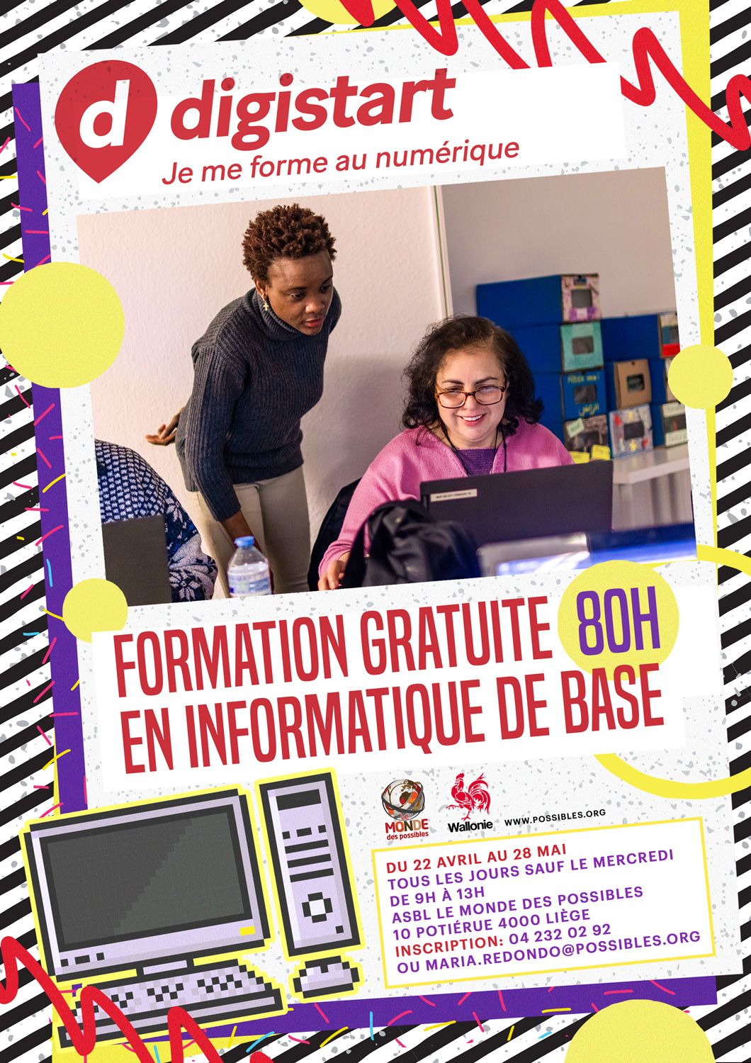 Avec le programme Digistart, Le Monde des Possibles développe un élément du numérique dans un ensemble de formations qui se complètent à l’interne et avec les partenaires liégeois. Sirius, Migralink, LIFT travaillent d’autres compétences numériques qui permettent aux stagiaires d’apprendre à utiliser les outils digitaux mais aussi à créer des contenus personnels, à être acteur.trice.s sur le web.